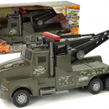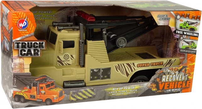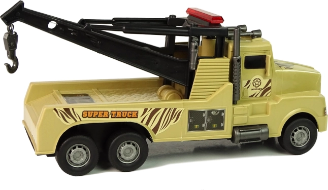 Robust plastbugseringsvogn i skala 1:10 med funktionelt spil og krog vil glæde små fans af byggeri og veje. Takket være friktionsdrev suser den frem efter at være trukket tilbage, med bevægelig kran og wire kan den bugsere andre legetøj, og dens militære design understøtter kreativ leg. Velegnet til børn fra 3 år, opfylder CE og EN71.