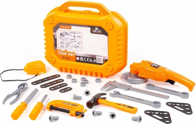 Komplet børnekuffert med værktøj indeholder 30 dele, inklusive en realistisk slibemaskine med roterende skive. Det lette og sikre plastmateriale er ideelt til børn fra 3 år og udvikler finmotorik, kreativitet og logisk tænkning. Takket være den praktiske transportable kuffert har børn alt overskueligt samlet ét sted.