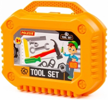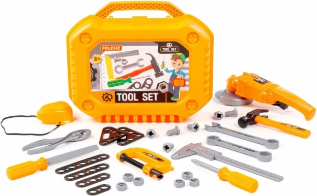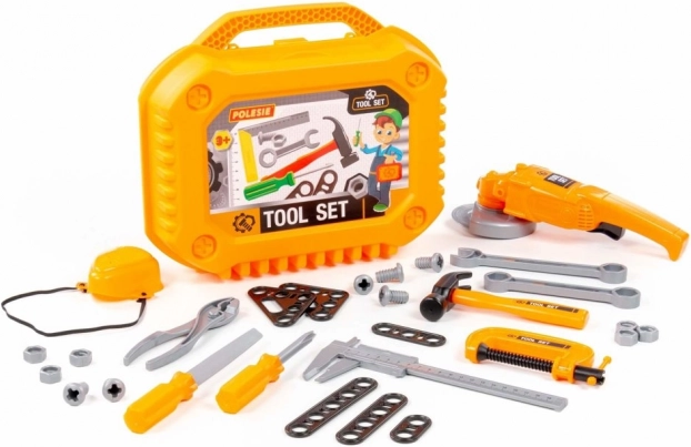Værktøjssættet er designet til små gør-det-selv-børn, der vil efterligne mor eller far i værkstedet og i haven. Alle dele er lavet af holdbar plast, er sikre at lege med og kan nemt opbevares i den robuste kuffert. Slibemaskinen drejer skiven, når knappen trykkes, og beskyttelsesmasken har en elastisk rem, så den passer til alle.