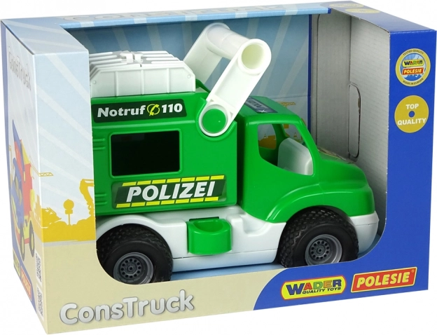 Opdag et kvalitets- og sikkert legetøj til de mindste – politibilen ConsTruck i grøn. Takket være den robuste konstruktion, gummihjul med slidbane og lette betjening er den ideel til de første racerlege og udforskning af verden. Den åbningsbare bageste hvide dør og det øvre rum gør det muligt for børn at transportere små skatte og figurer.