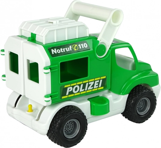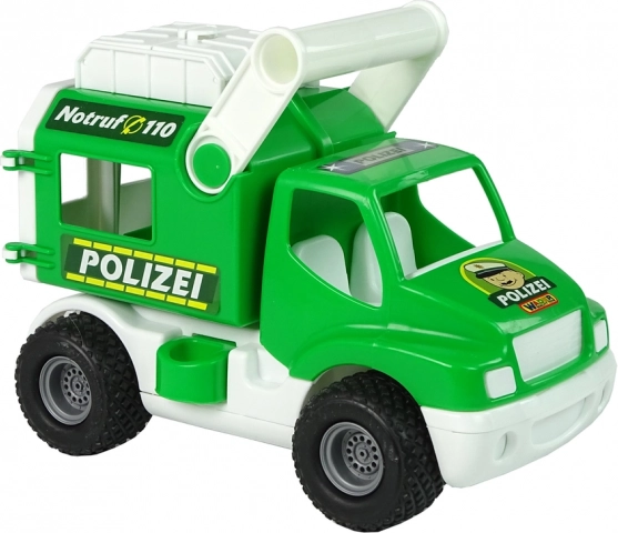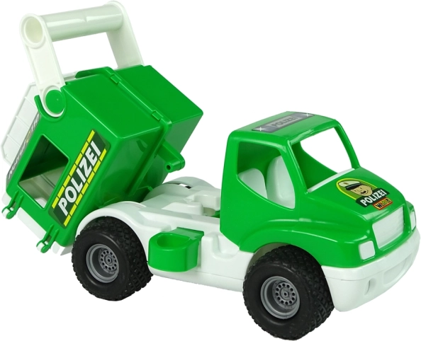 Den grønne politibil ConsTruck fra Polesie er et robust legetøj til børn fra 1 år. Den har gummihjul med slidbane for bedre greb, åbningsbar bagdør og øvre opbevaringsrum til at gemme skatte og figurer. En sidesikkerhedslås til traileren og en tippelad sikrer timevis af leg og understøtter finmotorik og logisk tænkning. Fremstillet af sikre, certificerede materialer med CE-certifikat.