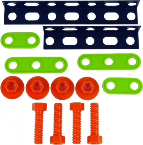 Sættet indeholder skruer, møtrikker, skiver og vinkelbeslag til de første konstruktioner og træning af finmotorikken.