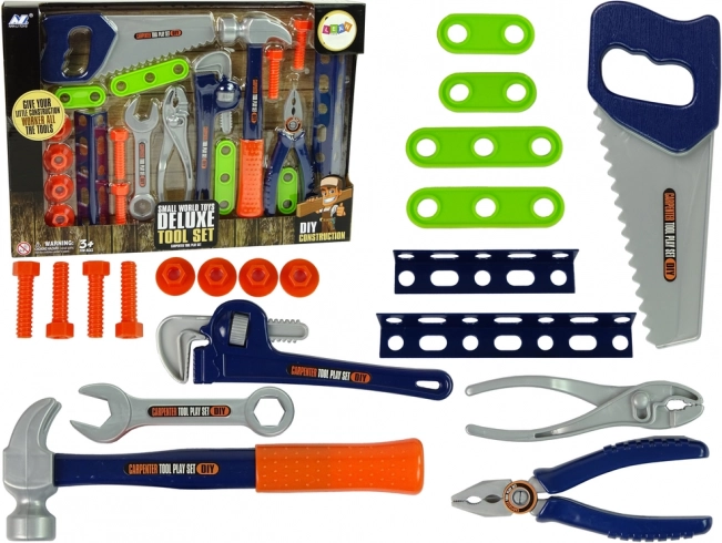 I pakken finder du alt, hvad den lille reparatør har brug for: hammer, sav, fransk nøgle, tænger (2 stk.), diverse nøgler, skiver, vinkelbeslag, skruer (4 stk.) og møtrikker (4 stk.). Børn kan bygge enkle konstruktioner, øve skruning og efterligne de voksne ved gør-det-selv-arbejde.