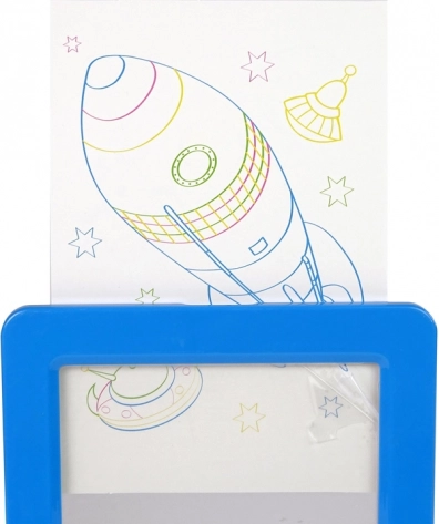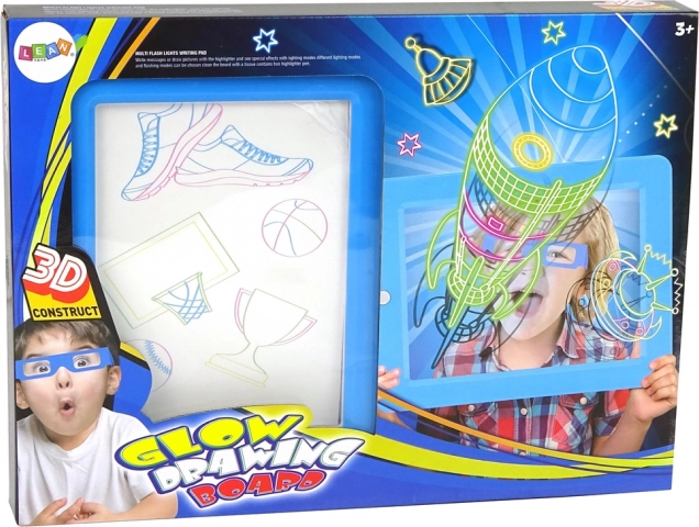 Den magiske oplyste tavle er ideel til de første skridt i både tegning og skrivning. Den gennemsigtige panelplade med LED-effekter får hvert strøg til at stråle, og med et tryk på en knap kan du vælge forskellige lysfunktioner. Indsæt blot en skabelon, tegn konturerne op med fluorescerende tuscher og tag 3D-brillerne på – billederne forvandles straks til et imponerende 3D-show.