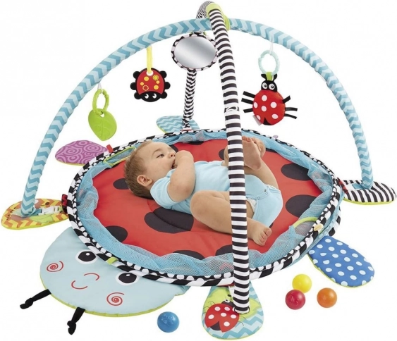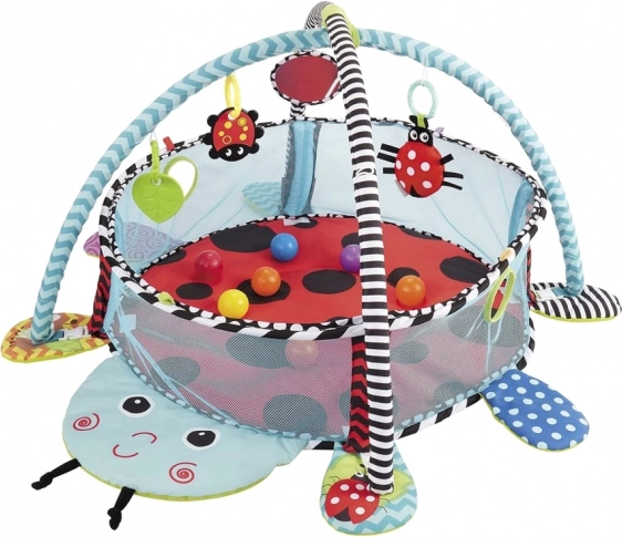 Det søde legetæppe i form af en mariehøne er ideelt til leg og motorisk udvikling fra de første måneder. Det tilbyder 3 måder at bruge det på (tæppe med bøjler, kravlegård, eller en kombination af begge), bløde og sikre materialer, net-sider for overblik samt 30 farverige bolde i en praktisk opbevaringslomme formet som en mariehøne.