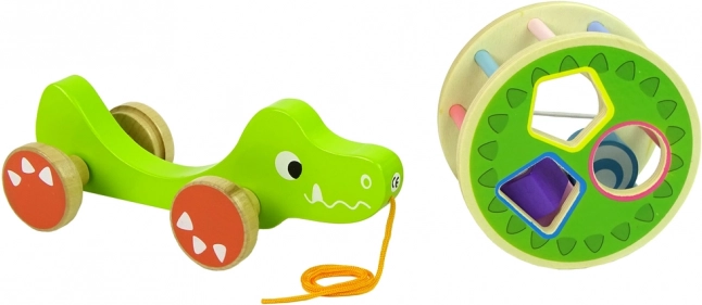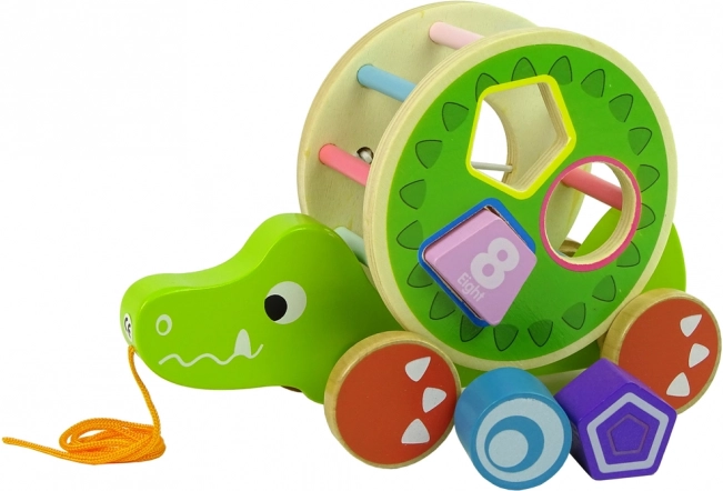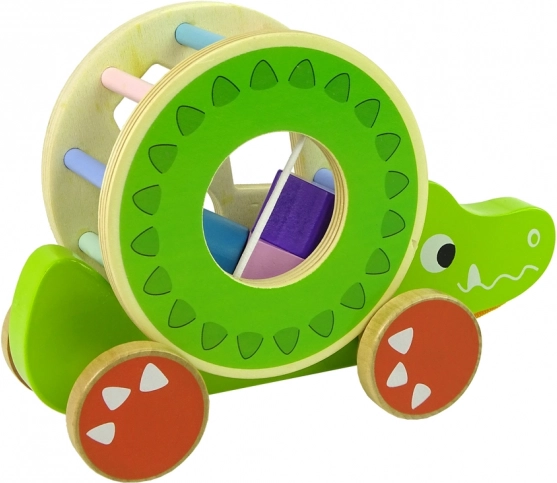Trækrokodillen med sorter byder på en række lærende elementer. Den store ring med sortering og tre klodser på ryggen træner præcision, genkendelse af geometriske former og forbedrer koncentration og logisk tænkning. Krokodillen er udstyret med farvede pinde, der stimulerer barnets synssans, og hjul med snor gør det nemt at trække legetøjet. Klodserne indeni fungerer som en rangle, hvilket fanger børns opmærksomhed og stimulerer høresansen. Den aftagelige ring på krokodillens ryg muliggør flere legevarianter.