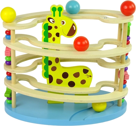 Denne farverige sklie har fire niveauer, hvor kuglerne triller ned, og dens form og bevægelse fastholder barnets opmærksomhed. Hvert element er omhyggeligt poleret og malet i klare, sikre farver. Trækonstruktionen sikrer langvarig holdbarhed og et legetøj, der holder i mange år.