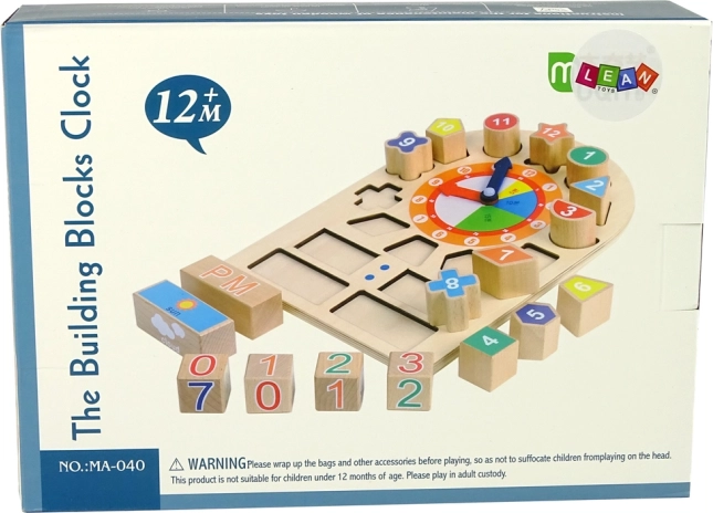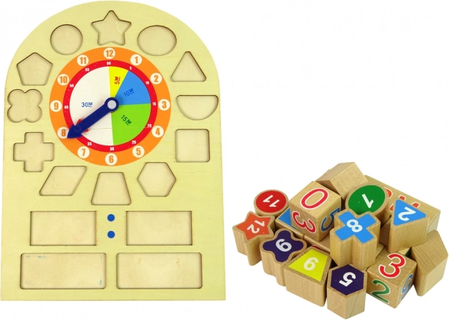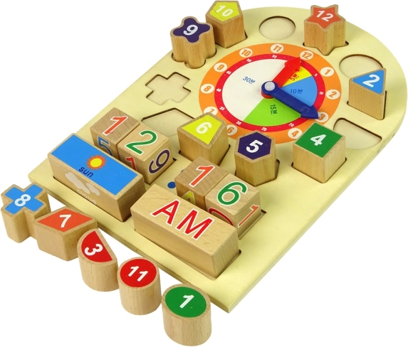 Træ-uddannelsesur til de mindste, som kombinerer leg og læring. Med det lærer barnet at genkende former, farver og også at læse klokken. Livlige farver stimulerer barnets fantasi og kreativitet.