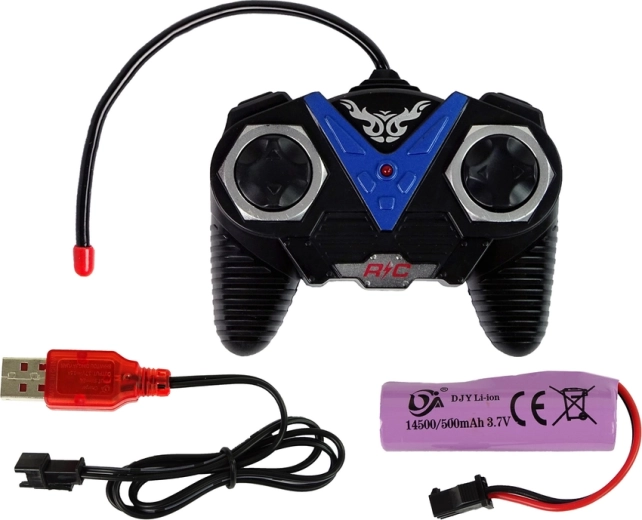Legetøjet med kontrol er CE-certificeret, hvilket først og fremmest vidner om høj produktkvalitet og sikkerhed i brug. Bilmodellen drives af det medfølgende 3,7 V 500 mAh batteri, og fjernbetjeningen (to dele) bruger 1,5 V AA-batterier (ikke inkluderet). Velegnet til børn fra 6 år.