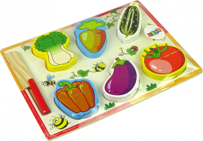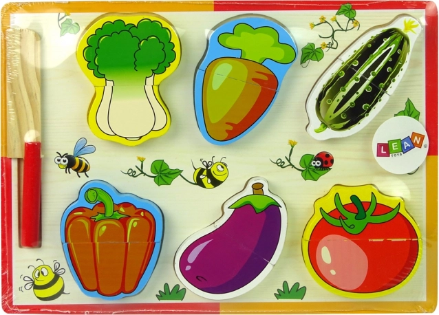 - Sættet indeholder: aubergine, gulerod, tomat, kål, agurk, peberfrugt, trækniv, skærebræt