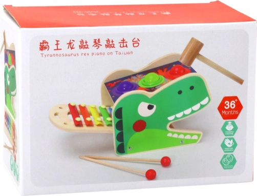 Trædinosaur 2-i-1 kombinerer aktiv bankesjov med musikalske færdigheder. Barnet banker farvede kugler ned med en hammer, som falder igennem og udvikler præcision, koncentration og håndmuskler. Den integrerede xylofon kan trækkes ud og bruges separat – en fantastisk måde at opdage toner, rytme og skabe egne melodier.