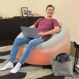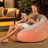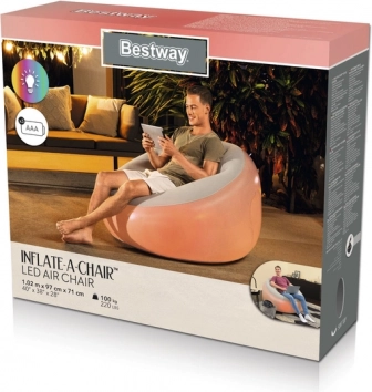 Den oppustelige BESTWAY-lænestol med målene 102 × 97 × 71 cm er en praktisk løsning til hjemmet, kollegieværelset og terrassen. Med integreret LED-belysning (7 farver) skaber den en behagelig atmosfære til filmaftener, gaming eller afslapning efter arbejde. Når den tømmes, fylder den minimalt og er nem at transportere.
