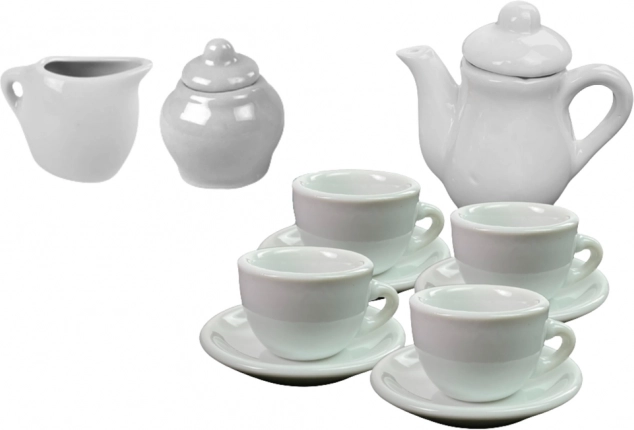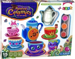 Sættet indeholder alt, hvad der er nødvendigt for dekoration af porcelæns te service - fra tekande til kopper og tallerkener. Børn kan dekorere servicen med deres egne mønstre og billeder, hvilket giver dem mulighed for fuldt ud at udnytte deres fantasi. Hvert stykke service bliver således et unikt kunstværk.