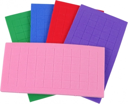 Sættet indeholder farvede skumfirkanter i fem forskellige farver: lyserød, lilla, blå, rød og grøn.