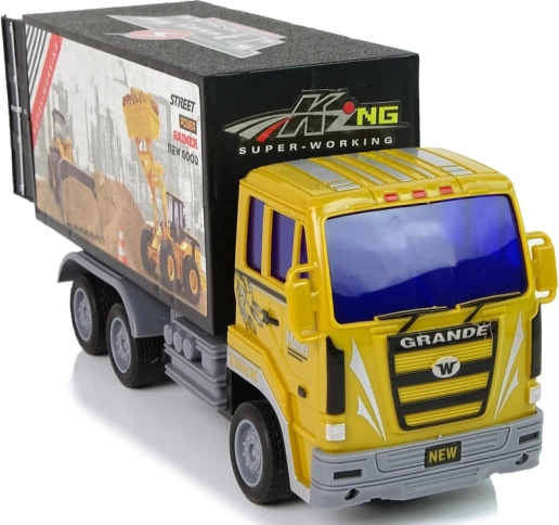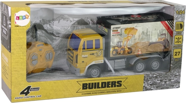 Den gule fjernstyrede byggelastbil giver børn mulighed for at styre deres egen byggemaskine. Med sort container og markante klistermærker er modellen autentisk og lader barnet simulere et realistisk byggemiljø. Betjeningen på 27 MHz tillader kørsel frem, tilbage, til venstre og højre, suppleret af lyseffekter, som forstærker legeoplevelsen.