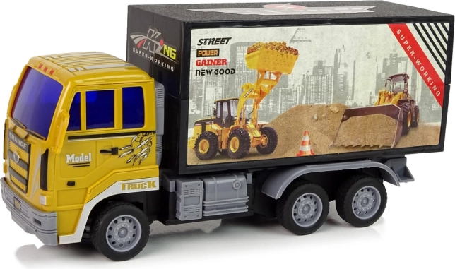 Lastbilen har en gul kabine og en sort container med markante klistermærker, der troværdigt efterligner en ægte byggemaskine.