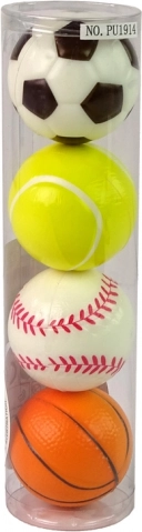Sjovt og sikkert sæt med fire bløde bolde til børn, der understøtter bevægelse, leg ude og inde og udvikler motorikken. De farverige bolde inspireret af sportsgrene som fodbold, golf, tennis og basketball er lette, behagelige at røre ved og egnede til børn fra 6 år.
