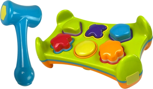 Sjov og sikker legetøj til de mindste: den tosidede sorter med hammer hjælper børn med at genkende former og farver, udvikler finmotorik, hånd-øje-koordination og tålmodighed. Takket være de farverige klodser og raslende lyde inde i blokkene er legen vedvarende populær hos børn.