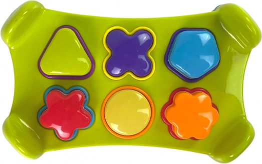 Toppladen med seks former og tydelige farver understøtter genkendelse af farver og former og fastholder barnets opmærksomhed.