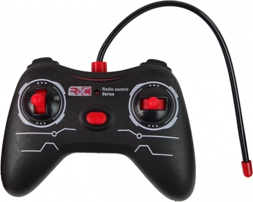 Fjernbetjeningen til R/C-køretøjet består af sorte komponenter kombineret med røde knapper.