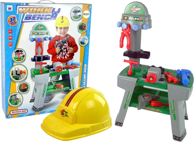 Sættet indeholder en robust arbejdsbænk og et bredt udvalg af værktøj: sav, hammer, skruetrækkere, skruestik, skruer med møtrikker, tang, tandhjul, hjelm og flere elementer til endeløse legescenarier. Sikker udførelse og holdbare materialer sikrer lang og bekymringsfri leg.