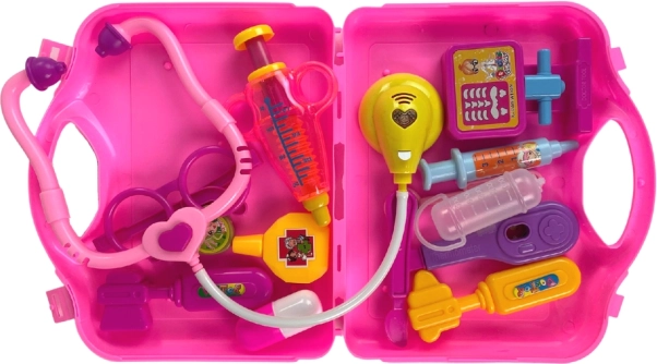 Sød lyserød lægekuffert til små læger, der byder på timevis af kreativ leg og læring. Indeholder sikre plastredskaber og et lysende stetoskop, som får et lille hjerte til at lyse, når det sættes på. Børn træner finmotorik, fantasi og overvinder lettere frygt for at besøge lægen. Alt opbevares i en praktisk bærbar kuffert.
