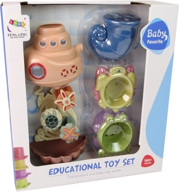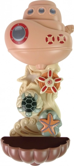 Det store skib i havverdenens form skaber et fantastisk vandfald. Under strømmen ryster farverige hjul med mønstre af havdyr. Legetøjet er nemt at fastgøre til badekarret med sugekopper på bagsiden.