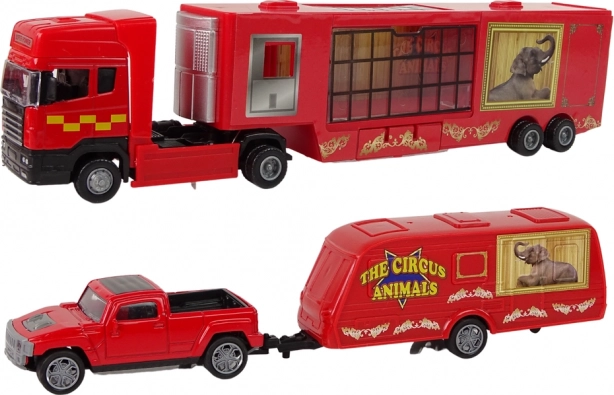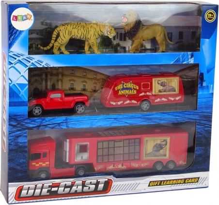 Dette sæt med cirkusbiler er en fremragende gave. Barnet finder her en stor lastbil til transport af dyr og en pickup med campingvogn. Sættet indeholder også to vilde katte – en løve og en tiger. Leg med dette sæt udvikler børns kreativitet og giver masser af sjov i mange timer. Lastbilen og pickuppen er lavet af metal, hvilket garanterer styrke og kvalitet for sættet.