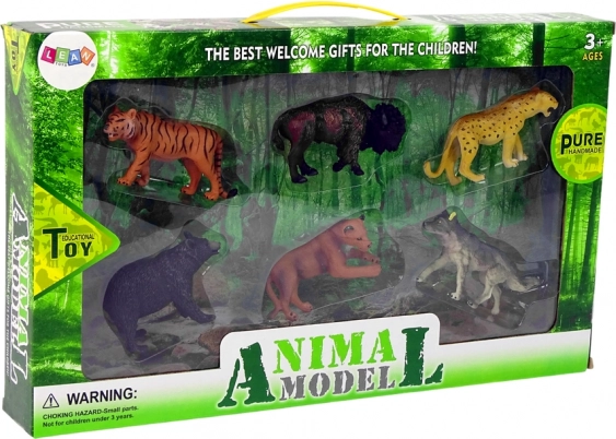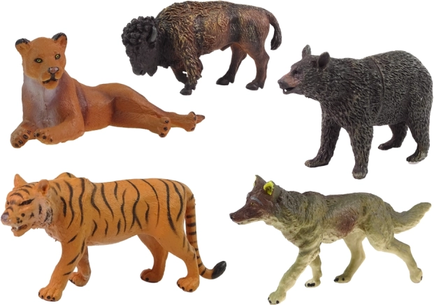 I sættet finder du 6 figurer: bjørn, ulv, jaguar, tiger, bison, løvinde. Figurhøjde: 10 cm x 6 cm x 4 cm. Æskens mål: 45 cm x 27 cm x 7 cm.