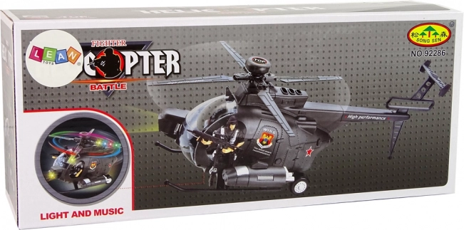 Lys og lyde gør legen realistisk. Helikopteren er sortmalet med bredt spredte vinger og understel til nem landing. To besætningsmedlemmer er en del af legen - den ene styrer, og den anden er klar til handling!