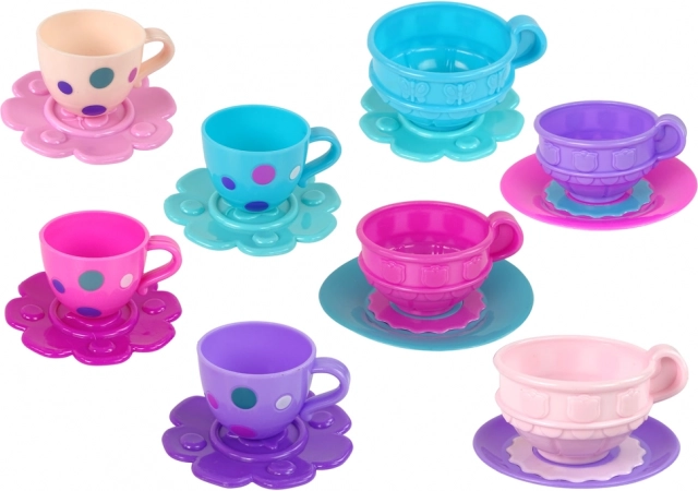 Sættet indeholder: 4 farverige kopper, 4 tallerkener, 4 teskeer, 4 gafler, 4 spiseskeer, 4 skåle, en lille kande, en sukkerskål og en tekande.