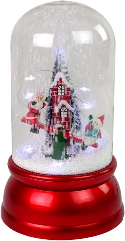 Denne juledekoration kombinerer skønheden ved en traditionel sneglobe med moderne funktioner. Den integrerede pumpe hvirvler den kunstige sne, som falder ovenfra og skaber en realistisk effekt af snestorm. Indeni finder du en glad Julemand sammen med en snemand på en gynge og en høj murstensskorsten med et juletræ – en scene, der glæder både børn og voksne.
