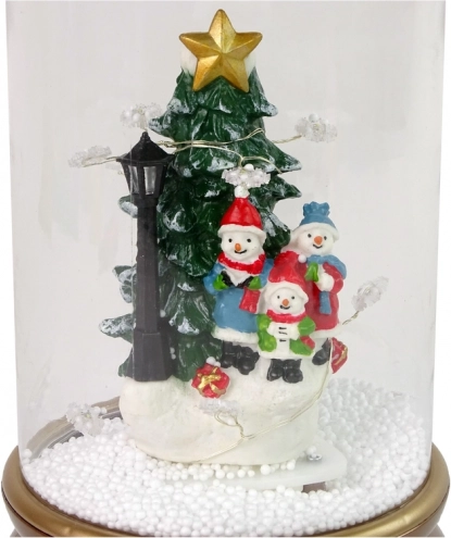 Stilfuld glaskugle til jul med en scene af en glad snemandfamilie ved juletræet giver din indretning et unikt, festligt præg. Den indvendige pumpe cirkulerer sneen fra soklen og sprayer den ovenfra, så der opstår en realistisk effekt af faldende sne. Dekorationen er oplyst af et behageligt hvidt lys, som skaber en varm vinterstemning.