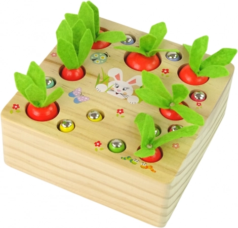 Hver gulerod har en anden størrelse – børnene lægger dem i de rigtige huller og udvikler naturligt logik og finmotorik.