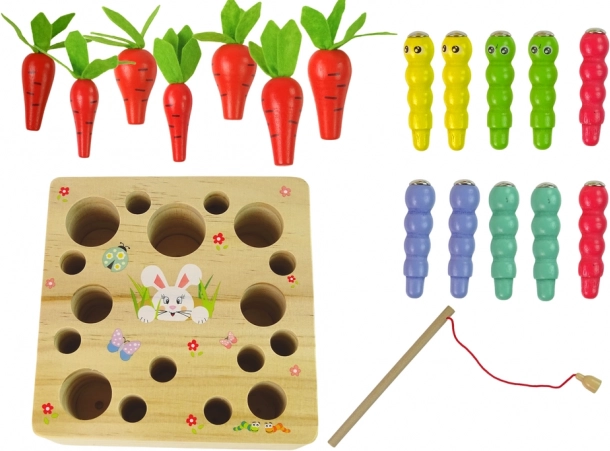 Komplet sæt med base, 6 gulerødder, 6 orme og en fiskestang. Den ideelle gave til børn fra 3 år.