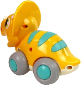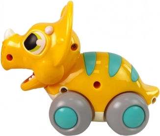 Denne farverige triceratops skiller sig ud med et muntert design med gul krop og turkise striber. Mekanismen med tilbagespoling gør det let at køre på flade overflader – barnet trykker legetøjet mod gulvet, slipper, og dinosauren kører afsted, mens den åbner og lukker munden undervejs. Et godt valg til leg både hjemme og på farten.