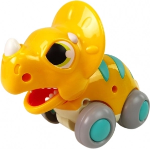 Den søde gule triceratops på hjul vil glæde ethvert lille barn. Tryk den mod gulvet, slip, og se den suse fremad. Legetøjet fremmer motorisk udvikling, læring af farver og former og motiverer børn til de første skridt. Fremstillet af sikre, materialer af høj kvalitet, opfylder EN 71 og har CE-certifikat.