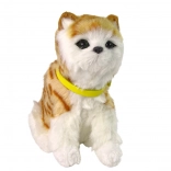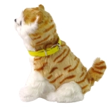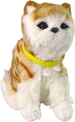 Denne realistiske plyskilling i hvid-rødbrun farve med brune striber og et gult aftageligt halsbånd vil charme ethvert barn. Når den bliver kælet på hovedet, vågner den til live – den miaver blidt og bevæger sødt hoved og hale. De bløde og silkebløde hår gør den til en favorit både i sengen og på farten.