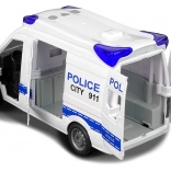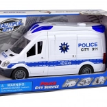 Politibil med sirene og blå blink er et valg for enhver ung fører af uniformeret tjeneste. Bilen er helt lavet af plast i farver, der passer til politibiler. Køretøjet har træk på forhjulene, hvilket gør, at det kan køre af sig selv. Lyd- og lyseffekter aktiveres med knapperne på taget.