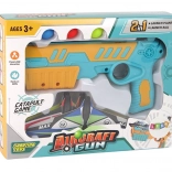 2-i-1 kugle- og flypistol er ideel til børn, der elsker spændende leg. Produktet er designet til at give børn kreative måder at lege på, samtidig med at det udvikler deres finmotorik og strategiske tænkning. Sættet indeholder fire fly og tre farvede bolde.