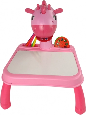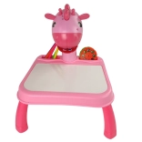 Projicér, tegn af og skab! Det lyserøde projektorbord med giraf gør de første skridt i tegning lettere. Indsæt en af de tre diske (i alt 24 billeder), tænd lyset og fokuser – konturerne projiceres på overfladen, og barnet kan nemt tegne dem op. Baggrundslyset kan ledsages af 12 muntre melodier, så det bliver endnu sjovere at skabe.