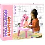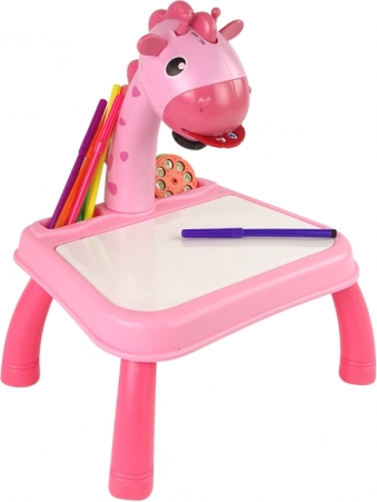 Lyserødt børne-projektorbord med giraf, der projicerer 24 motiver, gør det nemt at tegne efter og lære at tegne. I pakken er der 12 farvetuscher, et hæfte og en svamp. Indeholder også lys og 12 melodier, tør-slet overflade og justerbar skarphed for glidende og kreativ skabelse.