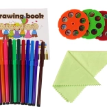 Medfølger: 3 diske (24 motiver), 12 farvetuscher, et hæfte og en rengøringssvamp – alt hvad den lille kunstner behøver.