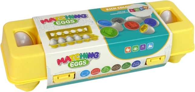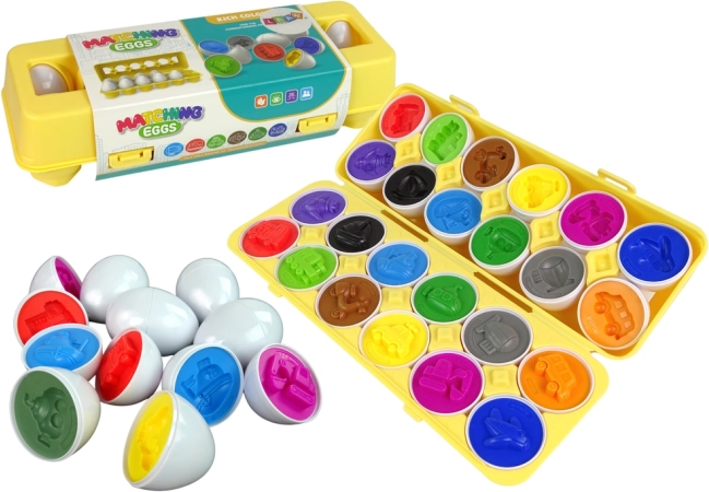 Sjov lærerig leg for børn: sæt med 12 æg med køretøjsmotiver, der sættes sammen og sorteres efter form og farve. Støtter finmotorik, hånd‑øje-koordination og logisk tænkning. Fremstillet af sikre, holdbare materialer, i en praktisk, lukbar æske formet som et æggebakke-plade.