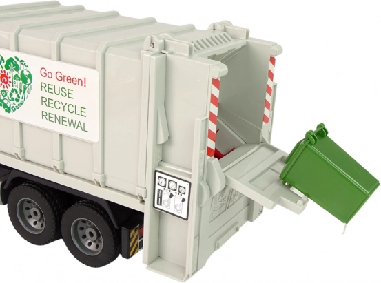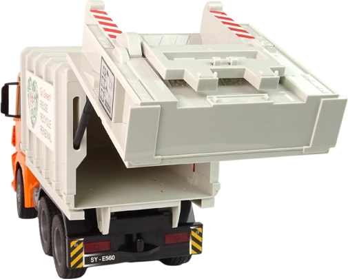 Lær børn affaldssortering på en legende måde. Denne detaljerede model af en skraldevogn med orange kabine og hvid container med grønne genbrugselementer tilbyder jævn kørsel frem/tilbage og styring takket være den pålidelige 2,4 GHz-fjernbetjening. Under kørsel ledsages den af realistiske lys- og lydeffekter, inklusive det karakteristiske bipsignal ved bakning.