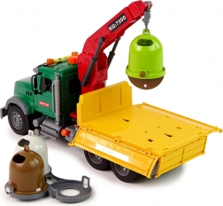 Denne detaljerede skraldebil transporterer alt det nødvendige – fra de medfølgende containere til små legeting. Den bageste trailer er udstyret med en bevægelig kran, der nemt løfter og sætter containere ned. På taget af kabinen finder du en betjeningsknap til at aktivere kranarmen og effekterne.