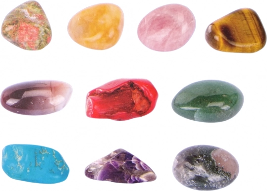 - “gipsjord”, mejsel, pensel, lille rive, hammer, lup, mineraler (fx tigerøje, ametyst, turkis), læringskort
