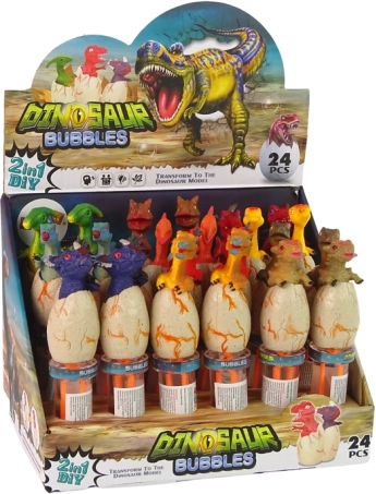 Gør børn glade med sæbebobler med dinosaurer – en 18 cm bobleblæser med låg formet som en dinosaur, der tilbyder sjov i det fri, forskellige farver og motiver samt en sikker, farveløs væske. Perfekt til haven og fester, egnet fra 3 år, opfylder CE og EN 71.