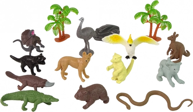 Sættet indeholder kænguru, koala, krokodille, emu, papegøje, slange, næbdyr, wombat, tasmansk djævel, firben, ørkenræv, 2 små træer og en klippe – alt hvad du behøver for at skabe din egen australske verden.