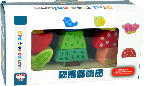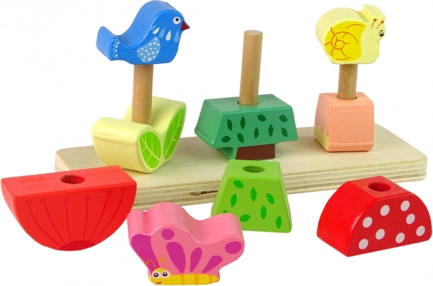 Dette træpuslespil består af en solid base med tre pinde, hvor børn sætter træklodser på i vilkårlig rækkefølge, så de passer sammen. Delene illustrerer planter, sommerfugle og fugle – opgaven er at tildele dem deres naturlige miljø korrekt, f.eks. sommerfugl til blomst eller fugl til træ. Puslespillet udvikler fantasi og viden om naturen.